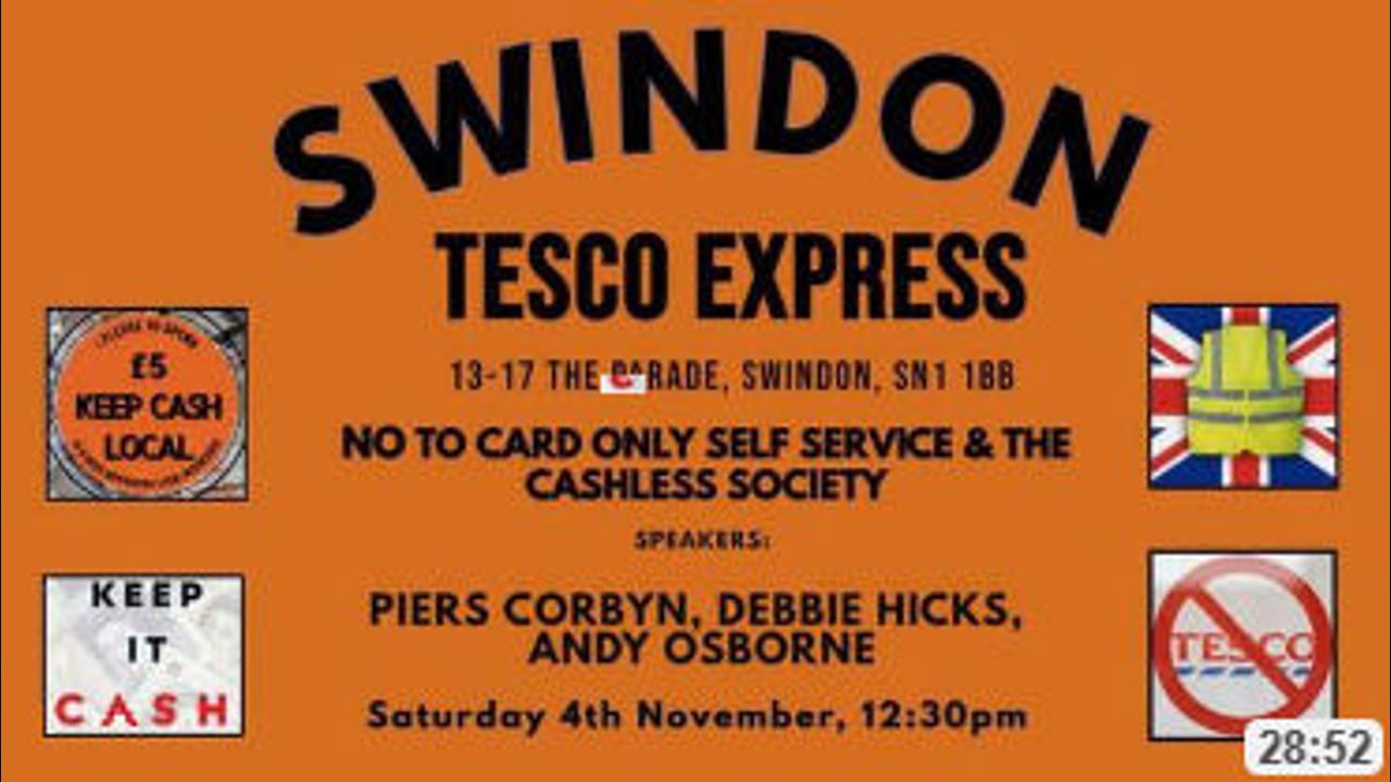 On 4th November 2023, Swindon Resistance held a mini rally outside Tesco Express in the town centre. This is the last remaining supermarket in town and it has gone card only on all self service tills. This is a slippery slope into a cashless society and a Central Bank Digital System. Slavery, not freedom!