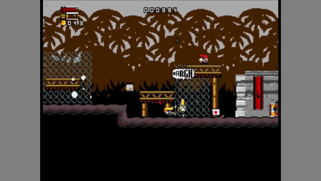 Your soldiers can run, jump, shoot and lean against low edges to fire from the safety of cover. Killed enemies drop various weapons, ammo, health items or gold. Weapons include flamethrowers, bouncing grenades, dual pistols that fire in two directions, jetpacks, high-power lasers and an egg-launching chicken gun. After shooting the pilot, you can enter and use Black Duck Army tanks. There are buildings wills randomly generated interiors you can enter. Sometimes, you find items, sometimes NPCs, stores or video game machines. The stores and some NPCs will sell you items for gold. At the game machines, you can play a bonus level for some gold. The machines may be used only once.