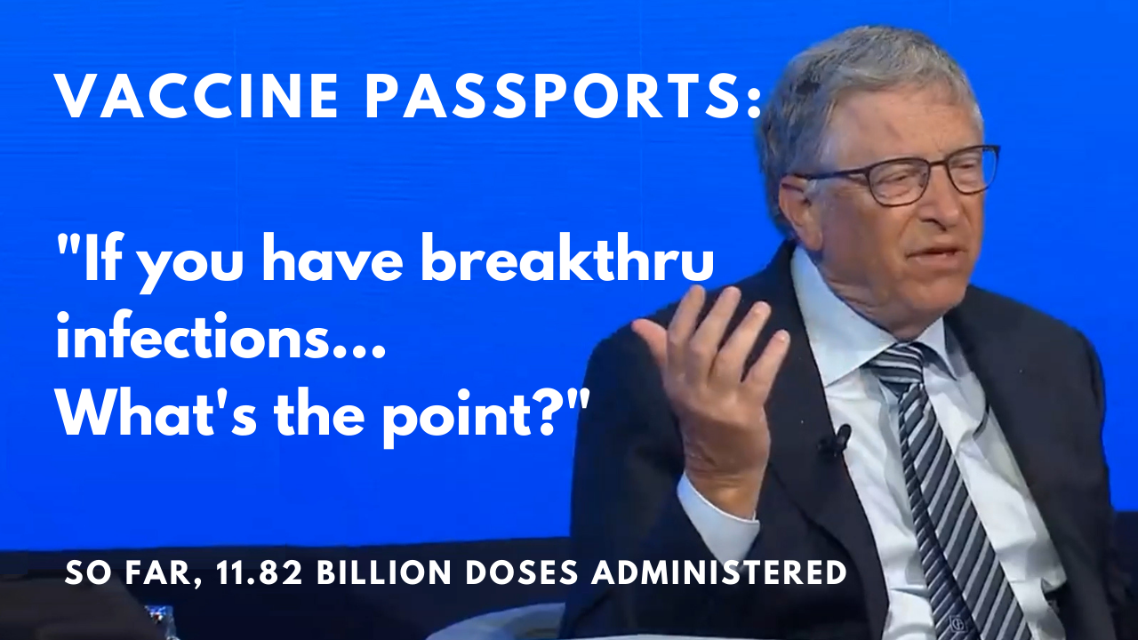 Now that it's too late...admission by Bill Gates on why have vaccine passports if the "vaccine" can't stop infection? The world continues to administer 6.76 million doses per day.