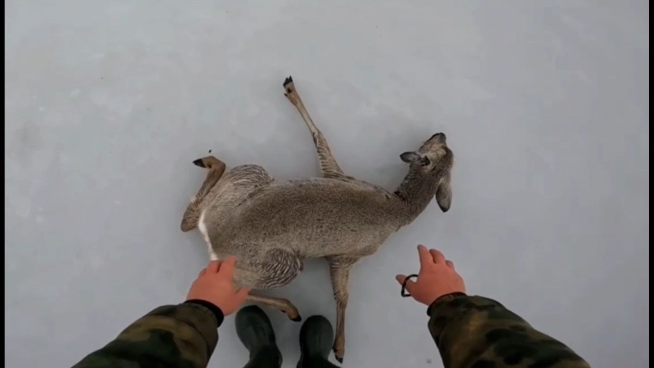 Men went to the lake in Novosibirsk (South Western Siberia, Russia) to fish but they had to rescue deer instead - a herd went onto the ice and couldn't reach the other side.