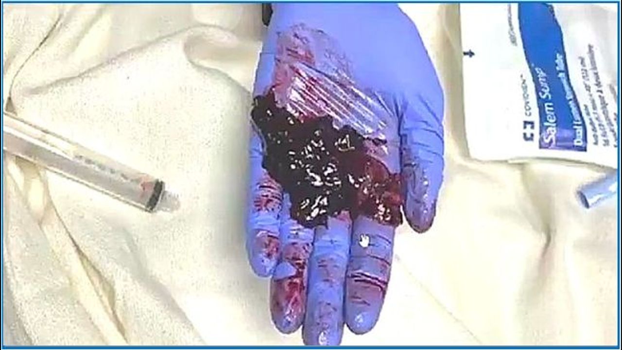 A registered nurse posted to her Twitter account an image a “string of attached blood clots” that were retrieved from a patient’s lung. Coolzero17 (aDonna58556659) posted to her Twitter account the image on October 3. She wrote, “Just pulled this from the lung of a fully vaccinated, Covid +, intubated patient. Still think those jabs are harmless?.