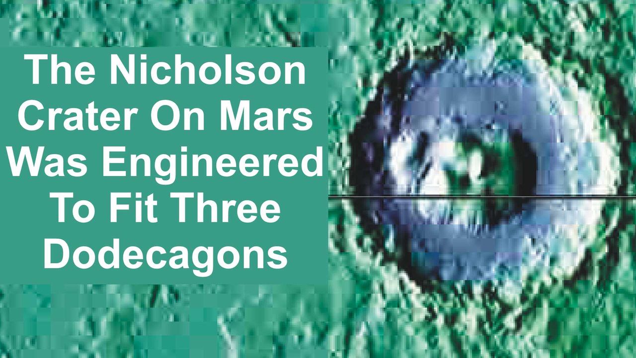 It was found that the straight line segments could be fit to 3 different dodecagons, The largest of these encloses most of the crater perimeter while 2 smaller dodecagons of equal size fit the eastern and western perimeters of the crater respectively. All 3 dodecagons have diameters which can be expressed by simple sacred geometry formulae. Also their centres have latitudes which can be expressed by simple sacred geometry formulae. The centre of the western smaller dodecagon coincides with the central peak of the Nicholson Crater which rises 3.5 km above the crater floor. This central peak has the appearance of a pyramid when viewed from the south, but is rounded in the north. This centre also coincides with the centre of 2 large squares which fit different linear segments of the crater perimeter