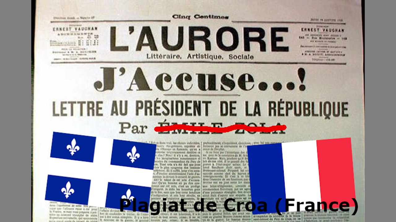 Comme Jean-Jacques Crèvecœur l'a fait pour son pays le Québec mais pour la France et les Français, j'accuse nos prétendues élites de haute trahison et de crimes contre l'humanité. Il m'a suffi de copier Jean-Jacques quasiment mots pour mots pour réaliser cette vidéo.
