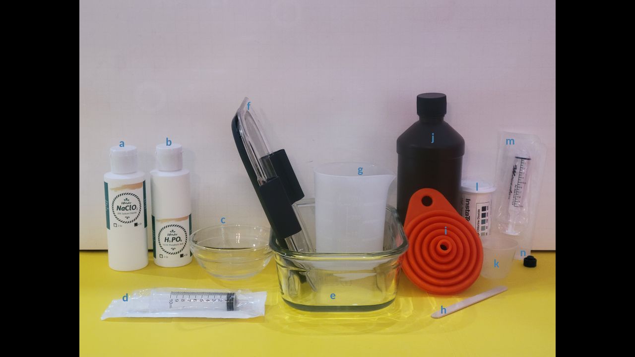 3. Mix 1.5ml of sodium chlorite solution, with 1.5ml of phosphoric acid solution into the glass bowl, for every 100ml of water