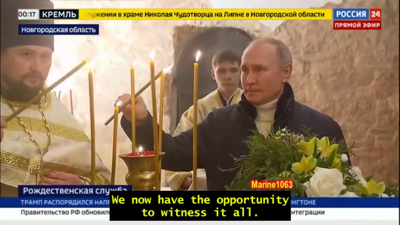 President Putin never ever uses notes to talk to others. He speaks from the heart: "The love of God for a human is expressed not in giving us every single thing that we ask him or that we wish for but in that it lets us pray for him and for us and hope for the best. That hope and, sometimes, the anticipation of a miracle is the very star that brightens our life path and supports us during its toughest stages." Orthodox Christians celebrate the Nativity of Christ. President Vladimir Putin arrived in the Novgorod region. He is attending a service at the Church of St. Nicholas on Lipno. He always goes to church especially on Easter and Christmas. More importantly he has helped rebuild Orthodox Churches that the communists destroyed.