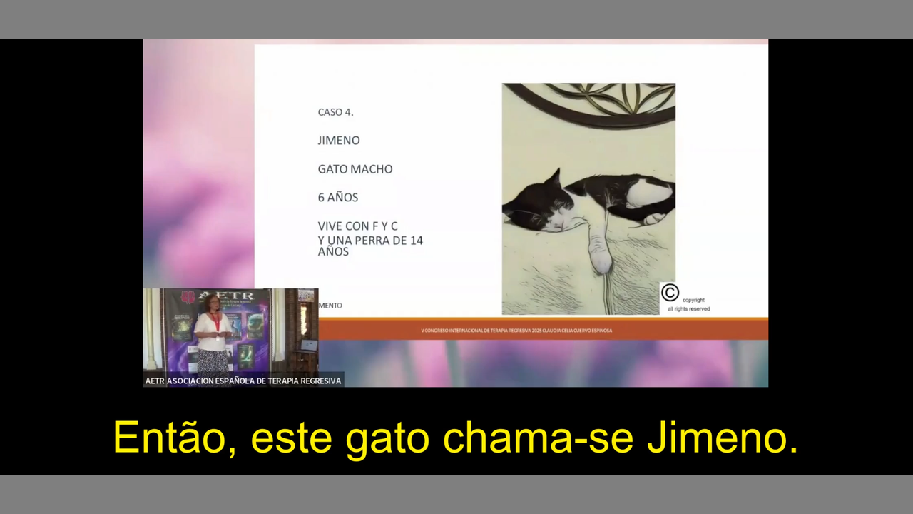 Fragmento do vídeo da licenciada Claudia Celia Cuervo Espinosa, sobre o caso do gato Jimeno, dentro da palestra intitulada «A alma e os programas biológicos de sobrevivência», de quinta-feira, 29 de maio de 2025, no âmbito do Quinto Congresso Internacional de Terapia Regressiva, realizado no balneário de Alicún de las Torres (Granada, Andaluzia).
