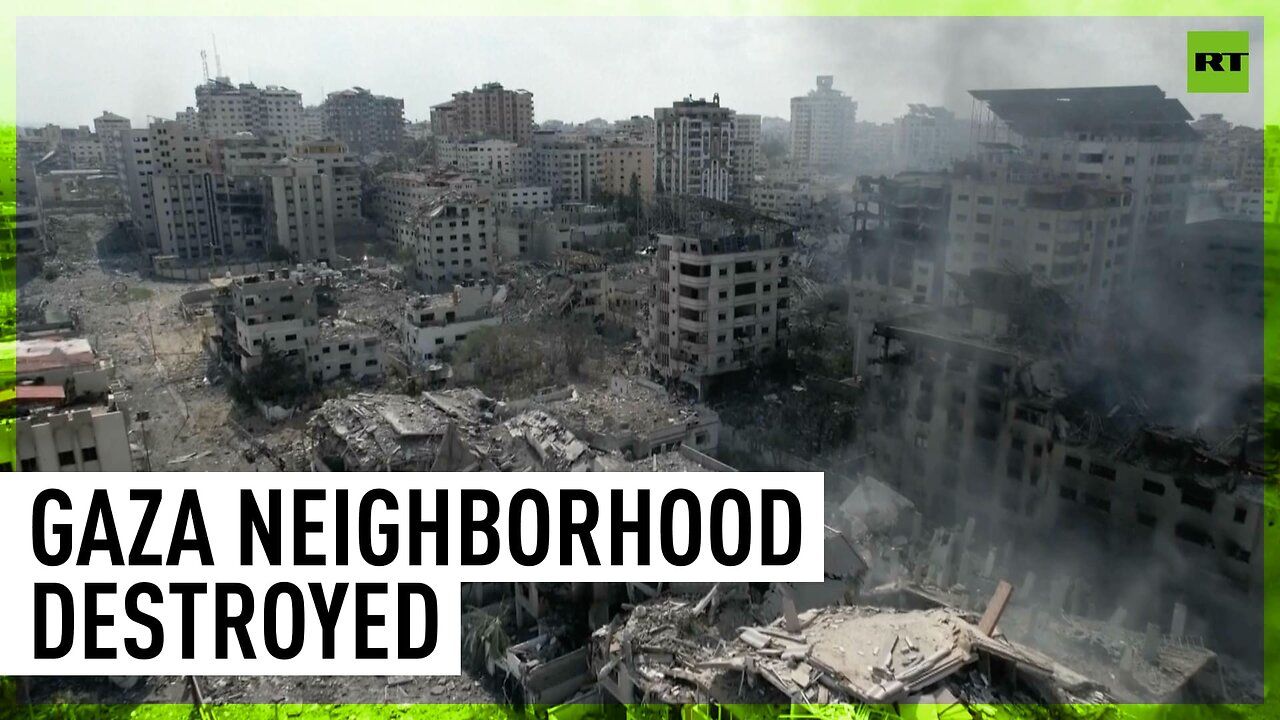 Drone footage from Gaza’s Rimal neighborhood shows damaged buildings, streets in rubble, and smoke rising after Israeli air strikes.
