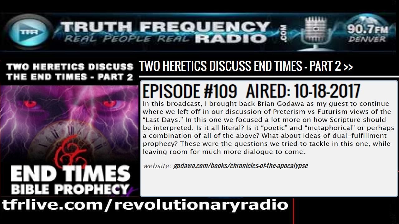 In this broadcast, I brought back Brian Godawa as my guest to continue where we left off in our discussion of Preterism vs Futurism views of the “Last Days.” In this one we focused a lot more on how Scripture should be interpreted. Is it all literal? Is it “poetic” and “metaphorical” or perhaps a combination of all of the above? What about ideas of dual-fulfillment prophecy? These were the questions we tried to tackle in this one, while leaving room for much more dialogue to come.