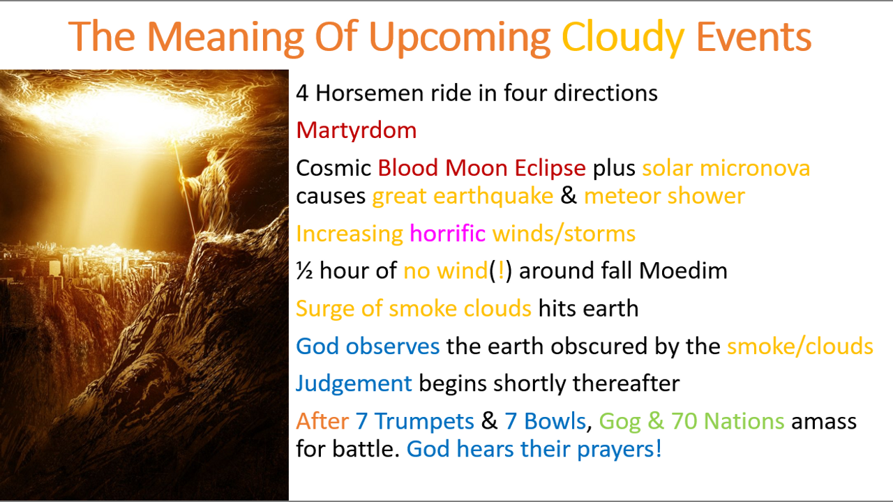 We've discussed previously how Revelation seems to offer glimpses of Yom Kipper in certain chapters. That helps us establish specific judgment timeframes to observe. Next we desire to know the signs that will help us understand we're going into the final seven years. What will they be? Smoke, clouds, winds, no wind, and God's presence seem to await us. In what sequence should they occur? Let's discuss!