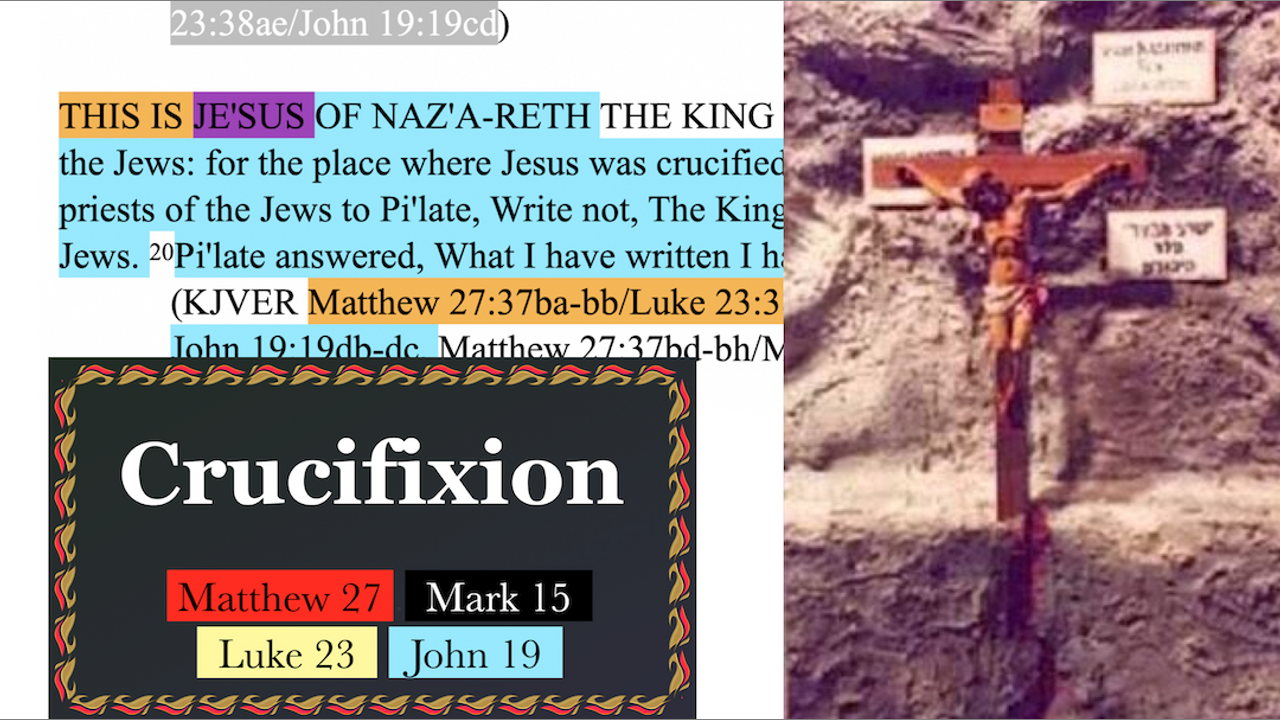 Matthew 27:37, Mark 15:27, Luke 23:38, John 19:19-22 combined