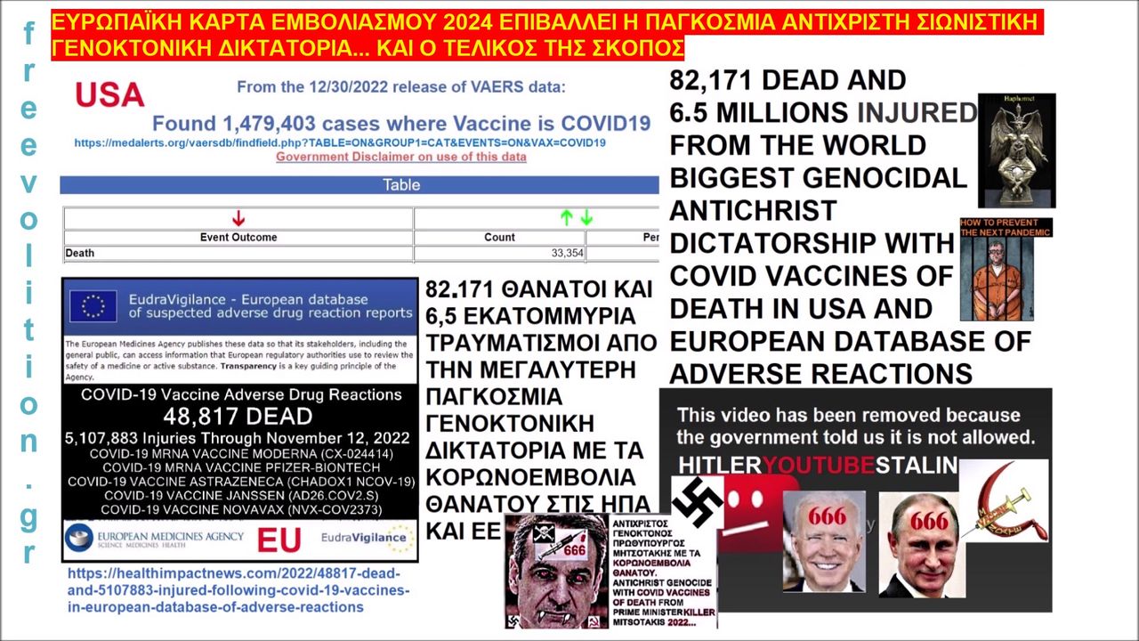 ΕΥΡΩΠΑΪΚΗ ΚΑΡΤΑ ΕΜΒΟΛΙΑΣΜΟΥ 2024 ΕΠΙΒΑΛΛΕΙ Η ΠΑΓΚΟΣΜΙΑ ΑΝΤΙΧΡΙΣΤΗ ΣΙΩΝΙΣΤΙΚΗ ΓΕΝΟΚΤΟΝΙΚΗ ΔΙΚΤΑΤΟΡΙΑ... ΚΑΙ Ο ΤΕΛΙΚΟΣ ΤΗΣ ΣΚΟΠΟΣ https://ugetube.com/watch/xx17HucbCUPYko6 , https://rumble.com/v5ddslp-european-vaccination-card-for-covidvaccines-of-death-dictatorship.html .
