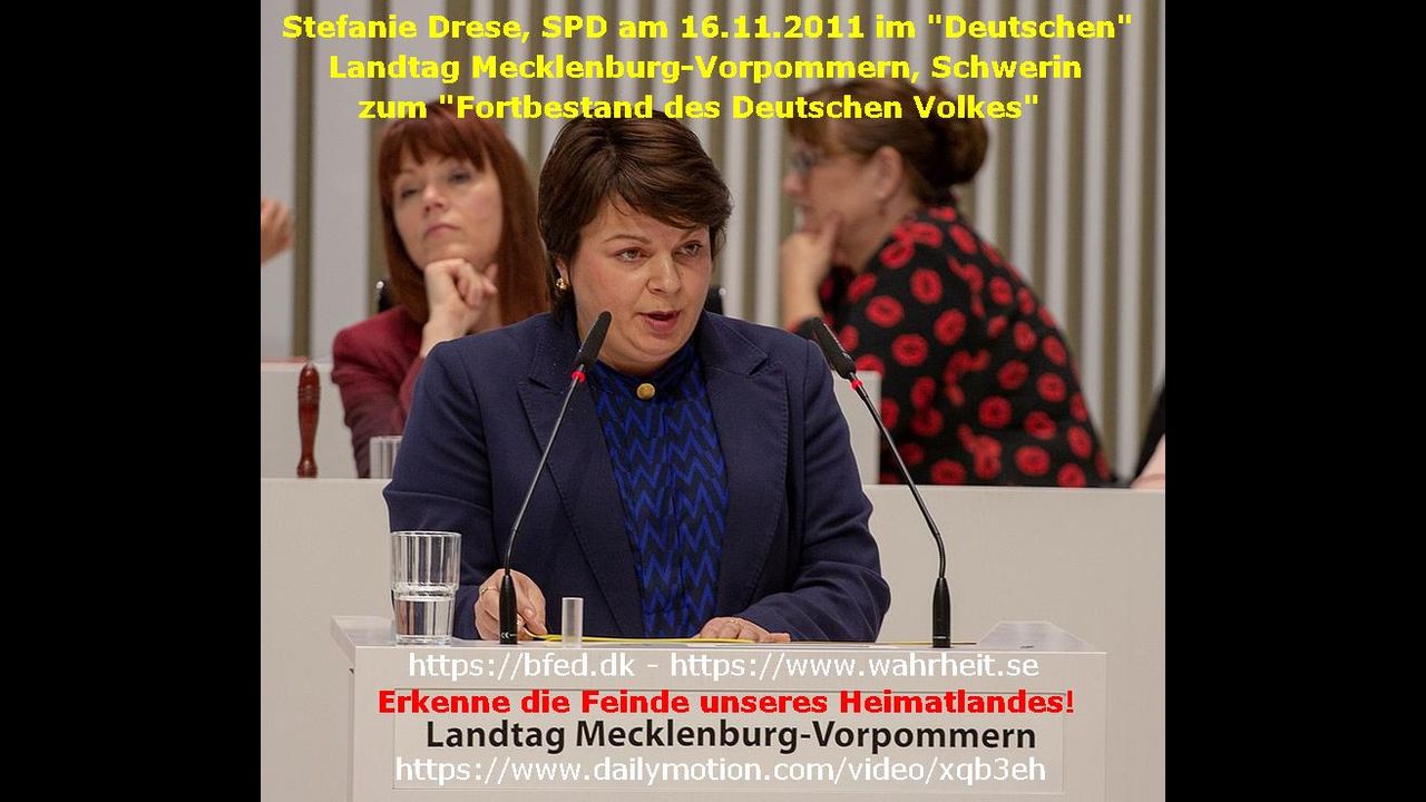 BRD-Demokraten sprechen Klartext: Stefanie Drese (SPD) - Das deutsche Volk abschaffen - Stefanie Drese, stellvertretende Fraktionsvorsitzende im Landtag von Mecklenburg-Vorpommern in Schwerin, am 16. November 2011, zum Antrag der NPD, den biologischen Fortbestand des deutschen Volkes zu bewahren.
