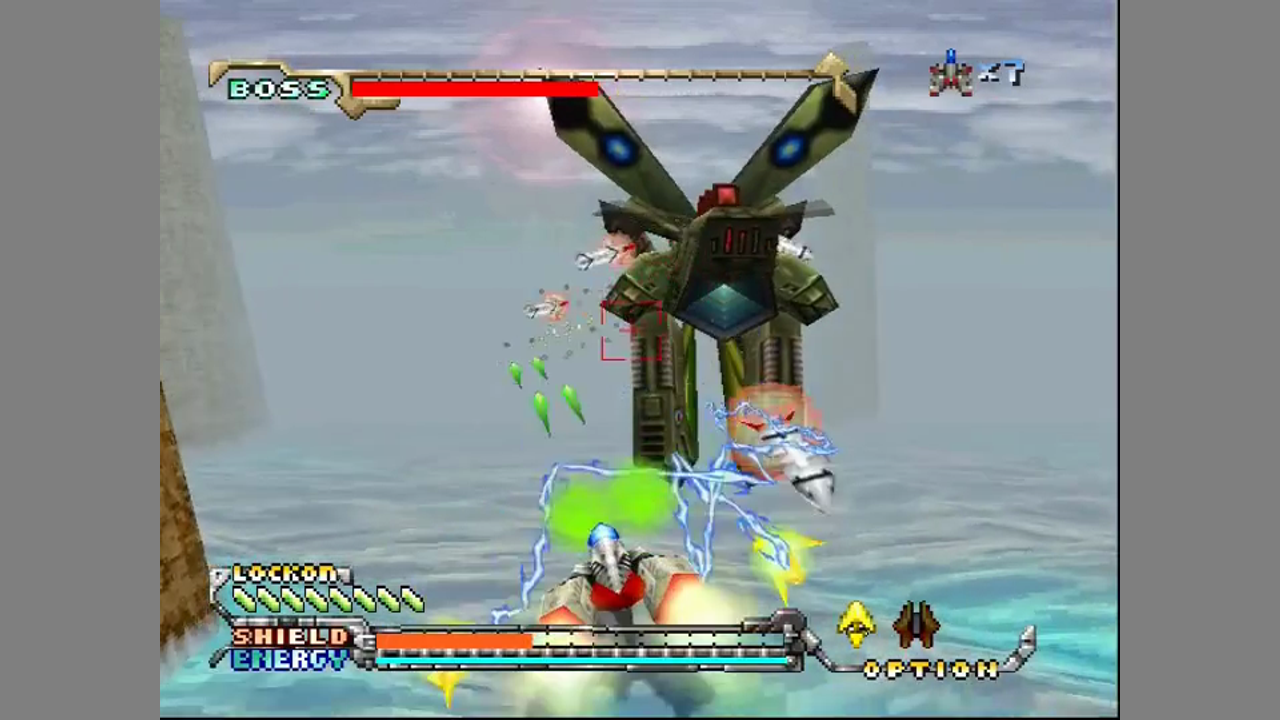 You can mov your ship to the left and right, and further "into" the screen, but you cannot lift off the ground. You can collect several weapons, and there is a limited number of bombs at your disposal. Holding down fire enables you to mark enemies with a crosshair. Once you let go, your ship will fire homing missiles at all marked spots.