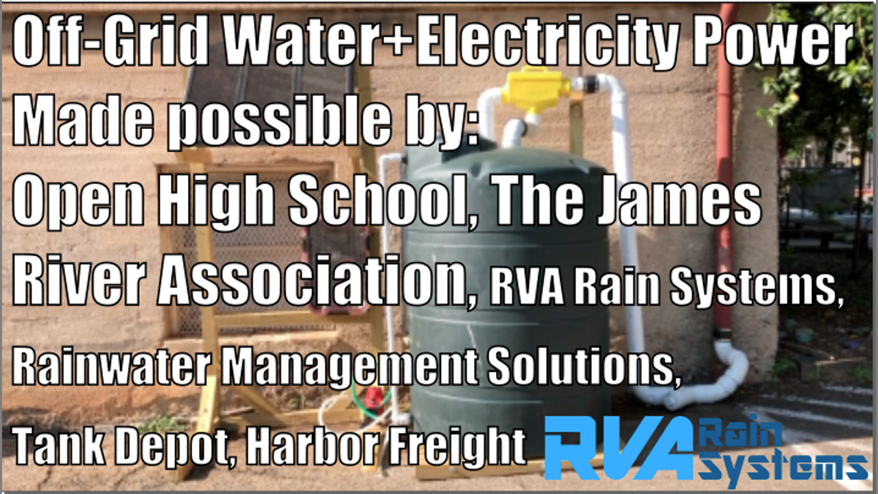 The order for this system was to be installed at Open High School for practical, environmental and educational purposes. Funded by The James River Association, designed and installed by RVA Rain Systems. 500g above-ground rain water system with 45-watt solar panel array, battery and inverter plus accessories included in a water-tight secure box. Custom built to be simple, functional, and educational. Like and Share!