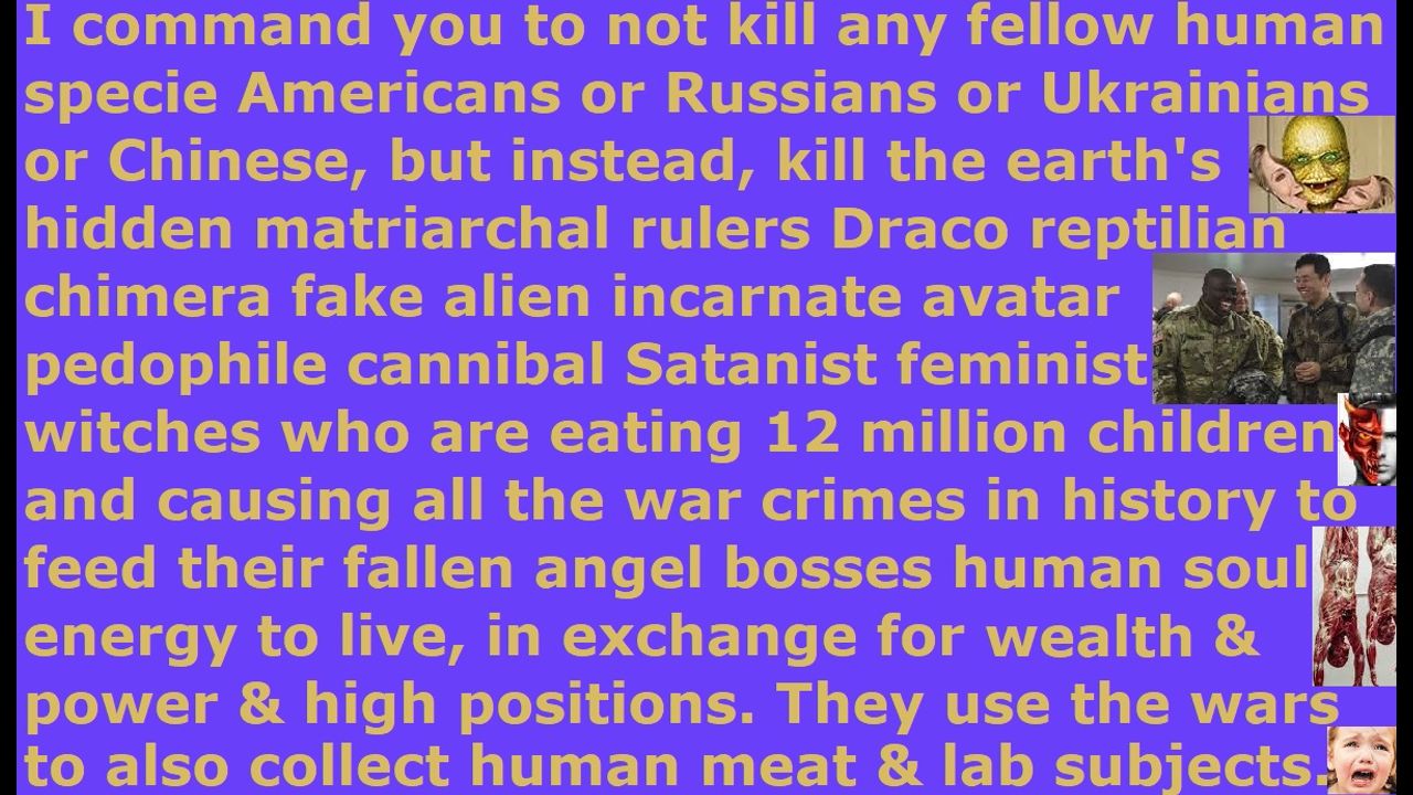 *** Intelligence news update from the Human Homo-Sapiens Race Survival Resistance (HRSR) headquarters and Republic Rebel Alliance battlefront (January 2025). I command you to not kill any fellow human specie Americans or Russians or Ukrainians or Chinese or Europeans or Iranians or Jews or Arabs or Taiwanese or North Koreans or South Koreans or any other humans, but instead, kill the earth's hidden matriarchal rulers Draco reptilian chimera fake alien incarnate avatar pedophile cannibal Satanist globalist elite feminist witches, who are eating 12 million children and causing all the war crimes in history to feed their fallen angel bosses human soul energy to live, in exchange for wealth & power & high positions. They use the wars to also collect human meat supplies & laboratory test subjects & organ DNA harvesting products & child sex slaves & off planet slaves. If you remain silent, and cover-up these earth’s hidden matriarchal rulers reptilian witches, then you are giving human authority permission by your silence, and you will have the blood of millions of people on your hands. Preach this in your next Sunday church service sermon, so that all your church member with assassins will try to assassinate you and slaughter your genetic descendant idols, and 99% of your church donators will leave your church in disgust & anger & sheer terror, so that God’s house will be cleansed of their religious filth. Do it now and do not wait until tomorrow, unless you are a crazy lunatic who has lost all common sense of the Holy Spirit. Jesus died on the cross to atone for your sins, and he rose again, and he is seated on his throne in heaven reigning, so that whoever repents and receives him as Savior & Lord will receive forgiveness for sins and the gift of eternal life. Salvation is by free grace and faith in the atoning blood of Jesus, and not by wearing women's head coverings or abstaining from cross-dressing in men's pants or abstaining from extorting fake illegal tithe income tax. Repent and receive Jesus as Savior, and make straight the way of the Lord! End of this transmission…