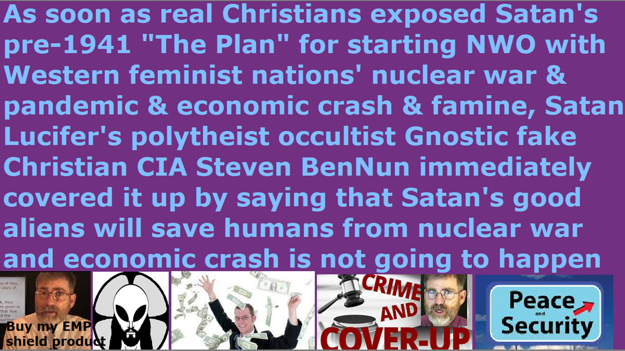 *** Intelligence news update from the Human Homo-Sapiens Race Survival Resistance (HRSR) headquarters and Republic Rebel Alliance battlefront (October 2022). Be aware that Steven BenNun is Satan Lucifer's cover-up disinformation agent to try to deceive God’s praying spiritual army. As soon as the real Christians expose that Satan Lucifer’s fallen angel fake aliens are planning to nuke all the Western feminist nations’ cities after the real Christians are raptured up to heaven, and that the NWO have their own nations’ nuclear bombs infiltrated into each city already for decades, Steven BenNun immediately broadcasts to the whole world that the aliens will shut down any nation that tries to use nuclear weapons, so everyone is safe and be happy. As soon as the real Christians expose that Satan Lucifer’s fallen angel fake aliens incarnate avatar black nobility families (Steven BenNun’s bosses) will be crashing the economy to start their vaccine digital currency biometric ID tattoo microneedle patch “Mark of the Beast” system after the real Christians are raptured up to heaven, Steven BenNun immediately broadcasts to the whole world that Joe Biden announced that he is running for a second term so that means the economy will be strong and healthy until then, so everyone is safe and be happy. As soon as the real Christians expose that Satan Lucifer’s fallen angel fake aliens incarnate avatar black nobility families (Steven BenNun’s bosses) are calling the COVID vaccine vaccinated people as a new specie of biological life forms called the homo-BorgGenesis, Steven BenNun immediately broadcasts to the whole world that the COVID vaccine is not the “Mark of the Beast” and you will not lose your soul from the vaccine’s DNA alterations, so everyone is safe and be happy. As soon as the real Christians warn the Western feminist nations’ religious Christian hordes to stop redefining Bible verses and rebelling against women’s head coverings so that their heads are controlled by the fallen angels, and to restore the original Bible verses, and stop replacing Jesus with foreign gods like Jezebel & Sananda Jesus & Mammon & Adephagia, Steven BenNun and Jana BenNun immediately broadcasts to the whole world that the original Bible verses’ understanding of male leadership is completely wrong, and that the true interpretation is that the women are equal to men in authority, and that they do not have to obey the Bible verses on women’s head coverings or submitting to male leadership. He spies on and counters everything that God’s real Christians warn the humans. He is a Satanist. This is why he mutilates the Bible verses, and makes up all kinds of false doctrines to mislead God’s flock, and makes millions of dollars of donation money, and sells Christian ministry business products to his customers. Carolyn Hamlett of the white witch faction, who worked directly with Satan Lucifer and the ascended master fallen angels and who was way above the Illuminati and the aliens’ levels, told us decades ago that even before World War 2 in Satan Lucifer’s pre-1941 “The Plan” the fallen angel fake alien devils had plans to destroy the Western feminist nations with nuclear bombs and pandemics and famine and asteroids and demon armies. Steven BenNun is hiding all of her information. He is saying that the fallen angel aliens are benevolent beings here to save us from their own fallen angel fake aliens’ nuclear wars and pandemics and manufactured famines and demon armies and asteroids and riots and narcotics and the 12 million annual Illuminati child sacrifice ritual cannibalism and economic crashes and digital currency Mark of the Beast COVID vaccines, so everyone is safe and be happy.