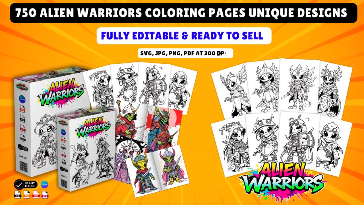 This amazing package includes 750 original, high-quality Alien Warriors Coloring Pages designed to attract audiences and generate sales on platforms like Amazon KDP, Etsy, and your online shop.