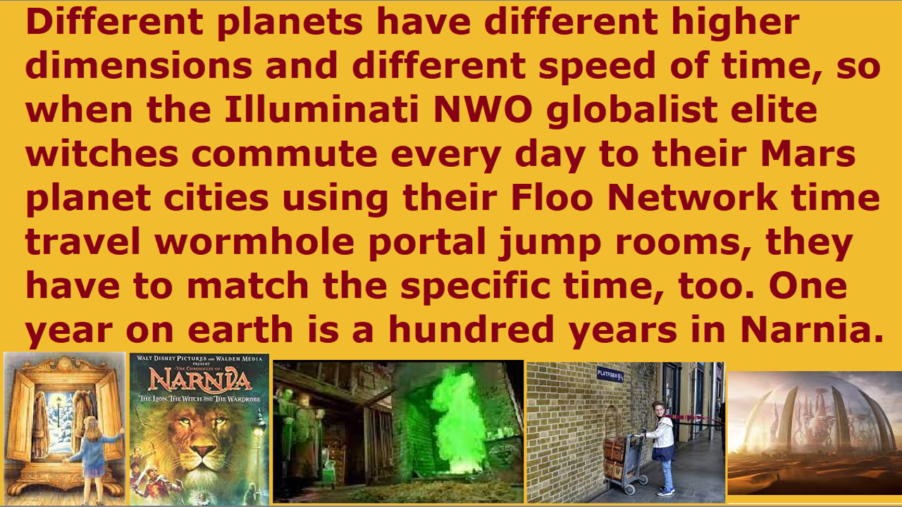 *** Intelligence news update from the Human Homo-Sapiens Race Survival Resistance (HRSR) headquarters and Republic Rebel Alliance battlefront (October 2021). Different planets have different dimensions and speed of time. Therefore, when the Illuminati NWO globalist elite witches commute to work from earth to their workplace office in Mars planet’s cities every day using their time travel wormhole portal Floo network jump gates, they have to match the proper time and not only location of their wormhole portal time travel jump. End of transmission…