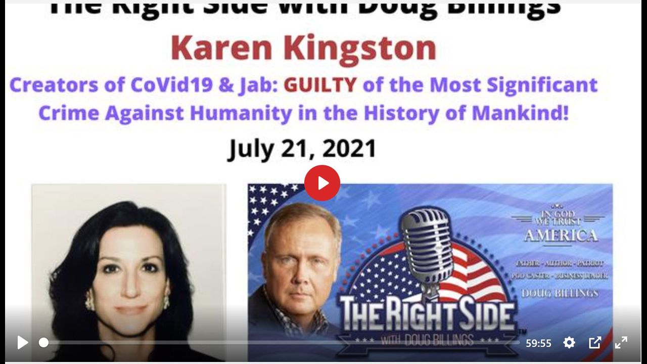 21st July, 2021 - Here is Part 4 of 6 of Doug Billings interview of Karen Kingston. Here she outlines her reasons why the creators of CoVid19 and the Jab are guilty of Crimes against Humanity.