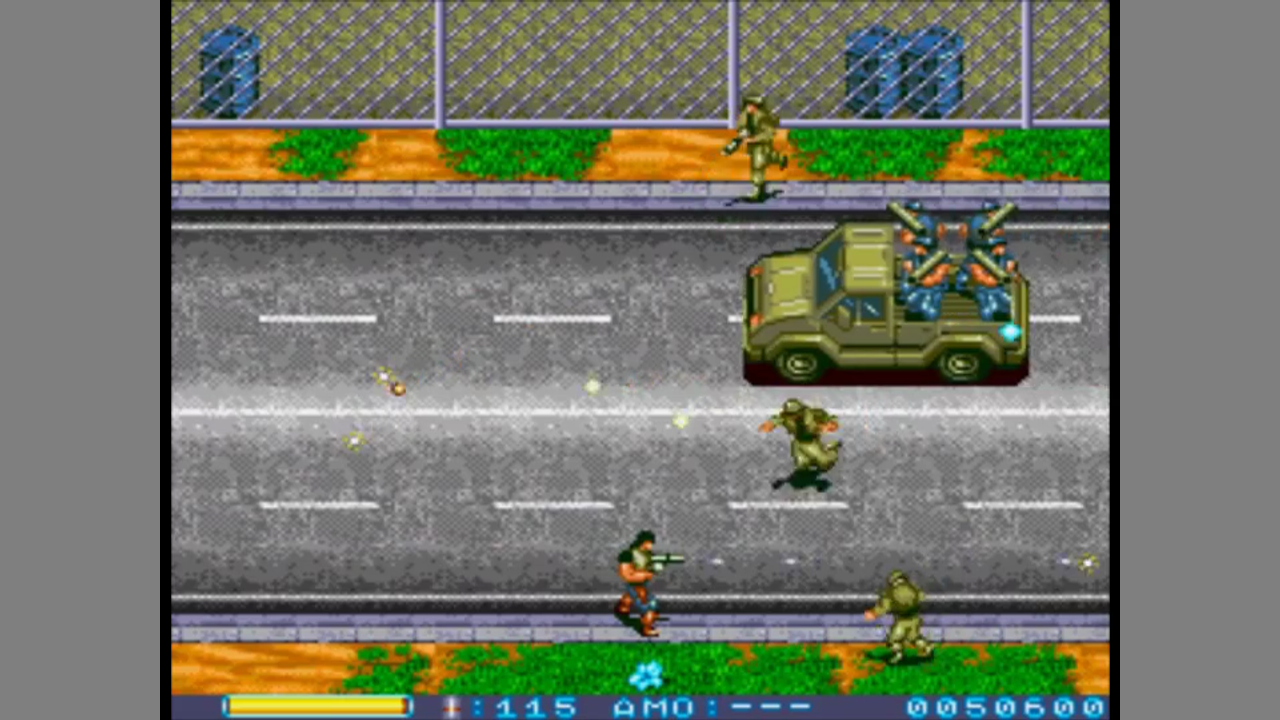 The game is a top-down shoot'em up similar to Mercs or Rambo III on the the Mega Drive/Genesis. You have a gun with infinite ammo and a limited stock of grenades. You can lock your position by holding down a button in order to fire in all directions without moving. You have a health bar, but only a single life. Stages can be accessed via passwords. Apart from medpaks and new grenades you can also find more powerful weapons like a shotgun or a machine gun. These weapons have limited ammo, though.