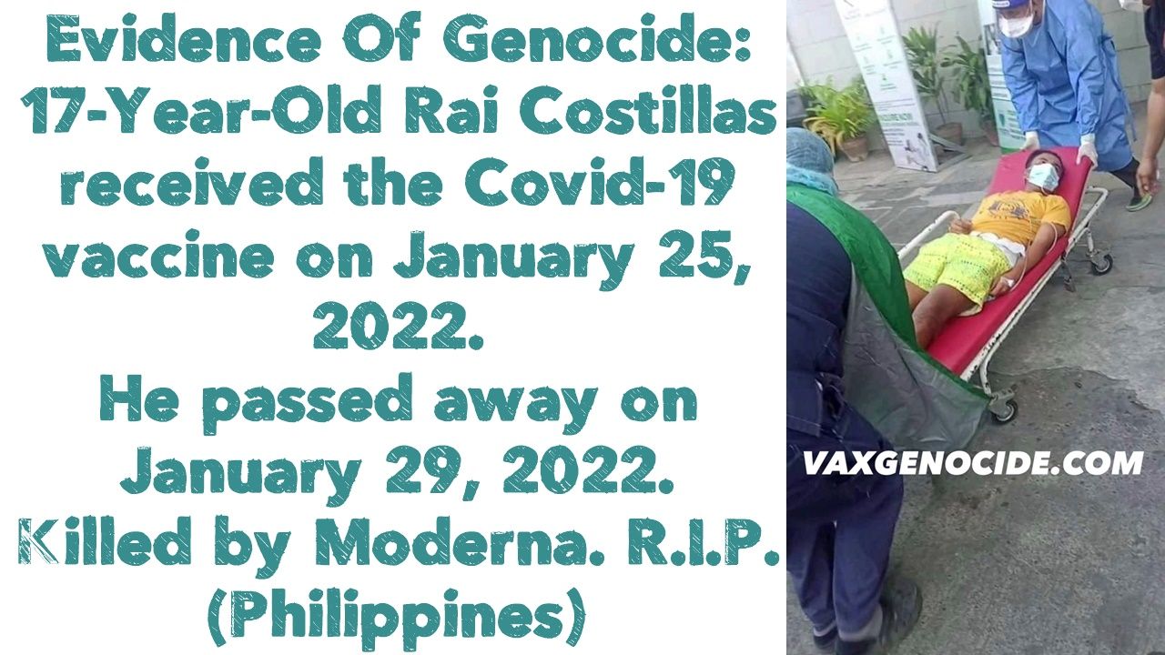 Evidence Of Genocide: 17-Year-Old Rai Costillas received the Covid-19 vaccine on January 25, 2022. He suffered a stroke and multiple seizures, as well as nausea and vomiting. He passed away on January 29, 2022. Killed by Moderna. R.I.P. 💉(Philippines 🇵ðŸ‡)