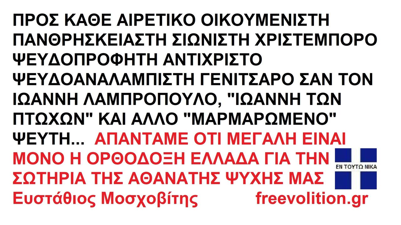 ΠΡΟΣ ΚΑΘΕ ΑΙΡΕΤΙΚΟ ΟΙΚΟΥΜΕΝΙΣΤΗ ΠΑΝΘΡΗΣΚΕΙΑΣΤΗ ΣΙΩΝΙΣΤΗ ΧΡΙΣΤΕΜΠΟΡΟ ΨΕΥΔΟΠΡΟΦΗΤΗ ΑΝΤΙΧΡΙΣΤΟ ΨΕΥΔΟΑΝΑΛΑΜΠΙΣΤΗ ΓΕΝΙΤΣΑΡΟ ΣΑΝ ΤΟΝ ΙΩΑΝΝΗ ΛΑΜΠΡΟΠΟΥΛΟ [email protected] , "ΙΩΑΝΝΗ ΤΩΝ ΠΤΩΧΩΝ" ΚΑΙ ΑΛΛΟ "ΜΑΡΜΑΡΩΜΕΝΟ" ΨΕΥΤΗ... ΑΠΑΝΤΑΜΕ ΟΤΙ ΜΕΓΑΛΗ ΕΙΝΑΙ ΜΟΝΟ Η ΟΡΘΟΔΟΞΗ ΕΛΛΑΔΑ ΓΙΑ ΤΗΝ ΣΩΤΗΡΙΑ ΤΗΣ ΑΘΑΝΑΤΗΣ ΨΥΧΗΣ ΜΑΣ https://ugetube.com/watch/Hodw8bBw5bj169a , https://rumble.com/v22hpay-antichrist-zionism.html .