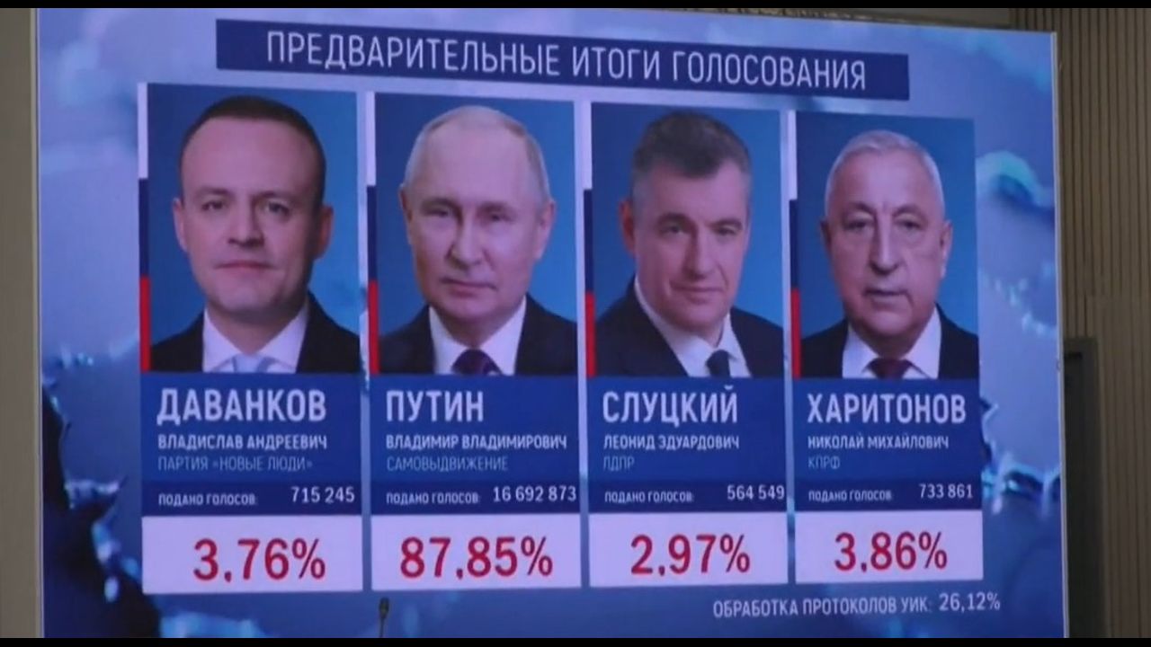 Description from video: A screen shown at a briefing by Russia's Central Election Commission shows the expected results of the four presidential election candidates. Incumbent president Vladimir Putin is expected to receive 87.85% of the vote, while Communist Party candidate Nikolay Kharitonov comes in at second with 3.86%, New People candidate Vladislav Davankov is projected to receive 3.76%, and far-right Liberal Democratic Party leader Leonid Slutsky is set to get 2.97%.
