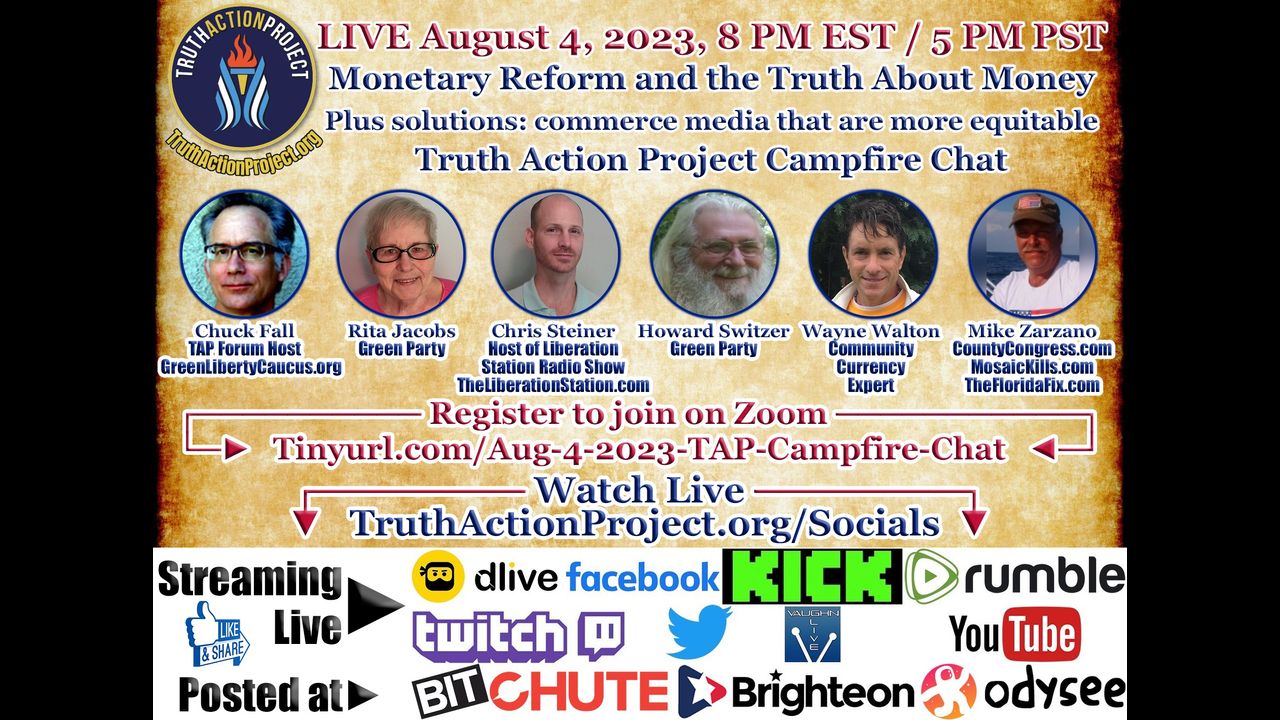 🔴 LIVE August 4, 2023, 8 PM EST / 5 PM PST: Monetary Reform and the Truth About Money • Plus solutions: commerce media that are more equitable • Truth Action Project Campfire ChatHosted by Chris Steiner, Host of Liberation Station Radio Show (TheLiberationStation . com), joined by other panelists from the July 27, 2023 TAP Forum: Chuck Fall (GreenLibertyCaucus.org), Rita Jacobs and Howard Switzer from the Green Party, Wayne Walton, Community Currency Expert (HourMoneyJubilee.com), and Mike Zarzano (CountyCongress.com, MosaicKills.com, TheFloridaFix.com)