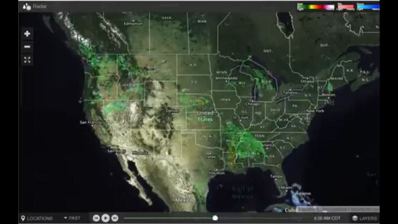The 'undulation' of all the storms in North America ceases around Sunrise East Coast time (530am ET) Multiple views in the video come from: