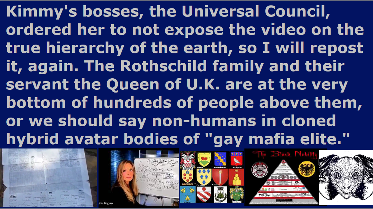 *** Intelligence news update from the Human Homo-Sapiens Race Survival Resistance (HRSR) headquarters and Republic Rebel Alliance battlefront (May 2022). I found out that Kimmy’s bosses, the Universal Council, ordered her to not expose anymore the video she posted about the true hierarchical structure of the world underneath Satan Lucifer’s Illuminati NWO top hierarchy “White Lodge Brotherhood” ascended master fallen angel devils, so I will post that video, again. Criminal investigative deduction tells me that the information is true and it hurts them, because they are trying to hide it from the 6 billion humans. Expose it now and do not wait until tomorrow! Inform all your church donators and God’s spiritual army now. All your family and the tens of thousands will fall down dead to your left and right, but you will remain standing unharmed. All their cooking you alive by CIA microwave oven weapons from next door homes and rooms will not harm you and God will just laugh at them. Believe the original Bible verses, and do not believe the Western feminist nations’ “Bible verses redefining women’s head coverings rebelling fallen angel head controlled” pastors’ redefined Bible verses, who want to get millions of lukewarm church donators. If they attack you, the original Bible verses says that, “May God arise, may his enemies be scattered; may his foes flee before him. May you blow them away like smoke—as wax melts before the fire, may the wicked perish before God. But may the righteous be glad and rejoice before God; may they be happy and joyful,” and “If God is for us, who can be against us?” The pastors redefined the Bible verses to say, “Condone the evil and dangerous subjects, and do not be the light of the world or watchmen on wall, and remain silent, in order to avoid assassination attempts and ridicule by church donators.” Kimmy says all the evil “gay mafia elite” Draco reptilian chimera alien incarnate avatar coven leaders of planet earth and Satan Lucifer have been removed and sent to Source (the Almighty Holy Creator God YHWH Jesus), but I think many of them are still around, because they are attacking my heart now from behind as I write this. If they were gone, they would not be attacking me. Kimmy would have been able to remove the COVID19 vaccine program long time ago, years ago. They are attacking also with deep sleepiness attacks and urine attacks and diarrhea attacks now, so they really do not like my daily sermon I am writing right now. These “fake aliens” evil spirits fallen angel devils have not disappeared, but they are still here, and their attacking and trying to kill us real Christians is proof that they are still here carrying out their NWO agenda. This is why the poison genocide COVID19 vaccinations have not stopped. It is simple criminal investigative deduction. End of transmission…
