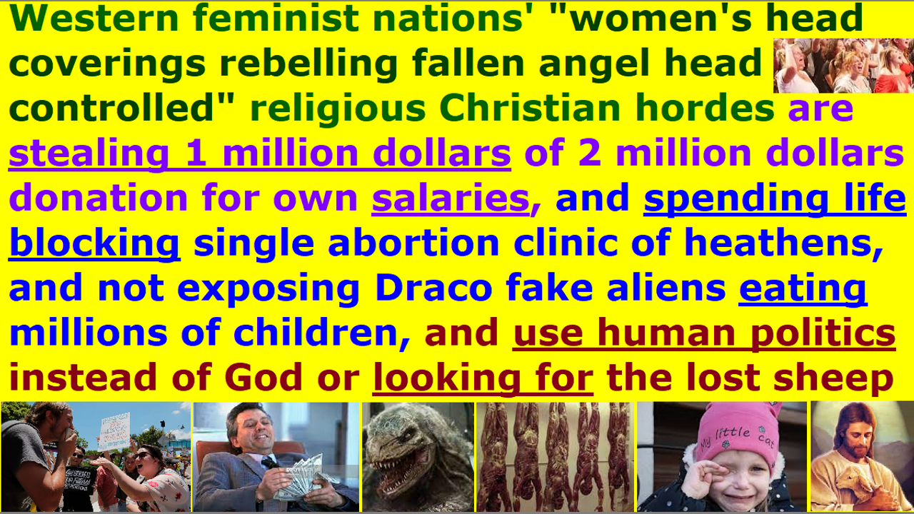*** Intelligence news update from the Human Homo-Sapiens Race Survival Resistance (HRSR) headquarters and Republic Rebel Alliance battlefront (January 2023). The Dracos are using the “women’s head coverings rebelling fallen angel head controlled” “Satan Lucifer’s post-1960s cross-dress-project men’s pants wearing” “unbiblical post-1873 10% salary illegal tithe income tax stealing” accursed Western feminist nations’ Illuminati reptilian hybrid Satanist sub-group’s motorcycle gangs to abduct children to sell them to the Draco reptilian chimera fake alien incarnate avatar CIA U.S. government to be fed to the Dracos as food. Expose that the Draco reptilian chimera fake aliens “Genesis 3:15 seed of the serpent” are eating millions of abducted children every year to all your church donators, or else, judgment will come upon you by getting your children confiscated for human meat food livestock & human child sex slavery & human laboratory specimen experiments & human organ harvesting & human child Satanist sacrifice ritual on their Draco Prime planet in the Alpha Draconis star system by abductions through their time travel wormhole portal. They are doing all kinds of things to these children. They are feeding them alive fresh to the Draco reptilian chimera fake alien “Genesis 3;15 seed of the serpent” whose staple diet are live human children, and feeding them to the reptilian hybrid pedophile cannibal Satanist Pedogate Pizzagate “White House Pizza Night” child sex magick ritual New Age Wicca witch Illuminati feminists. They are torturing them by gauging their eyes out alive, and pulling out their intestines alive, and eating their limbs alive, and having animals rape their genitals alive, in order to increase adrenalin in their blood to drink their adrenochrome blood alive. They are feeding the children to the other children, too. They also throw any children that die from the experiments or tortures into the yellow vats, because the Dracos prefer eating them alive but also eat dead humans, too. Those children whose minds were too destroyed from the time travel experiments would be shot and eaten. Many children disappear and do not come back from the time travels. They are making the children torture other children, and rape other children, and rape animals, and torture cute animals, and making animals rape other children, and traumatizing children by making them watch other children being ripped to pieces and eaten by wild animals, in order to fragment their minds into DID “multiple personality disorder” “demoniac of Gerasene” demon-possessed children radical fanatic feminists and sodomy-demon-infused gay homosexuals, to use them as assassin alters and child sex slave alters and space fleet crew alters and space fleet soldier alters and spy alters and mass shooting terrorist alters and church pastors and other jobs. Some of the Illuminati occult families’ “up to 4 years old sodomy demon-infused” “fragmented mind multiple personality disorder” child sex slave children grow up to be fanatic feminists and “gay mafia elite” New Age Wicca witches, and many of them are inside the churches, too, to infiltrate and mislead the religious Christian hordes and pastors who are rebelling against women’s head coverings so that their heads are controlled by the fallen angels. These religious Christian hordes steal 1 million dollars for their own salaries from the 2 million dollar donations, and stand in front of a single abortion clinic to harass visitors, instead of bringing in God to stop the witches’ pedophile cannibal Satanist abortion sacrifice rituals, and going out into the world to seek God’s lost sheep and disciple them. They mislead people to politics, while hiding the Dracos eating millions of children, because they are afraid of assassinations and being seen as crazy lunatics by their church donators.