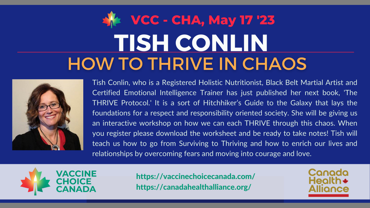 Tish Conlin, who is a Registered Holistic Nutritionist, Black Belt Martial Artist and Certified Emotional Intelligence Trainer has just published her next book, ’The THRIVE Protocol.’ It is a sort of Hitchhiker’s Guide to the Galaxy that lays the foundations for a respect and responsibility oriented society. She will be giving us an interactive workshop on how we can each THRIVE through this chaos. Tish teaches us how to go from Surviving to Thriving and how to enrich our lives and relationships by overcoming fears and moving into courage and love.