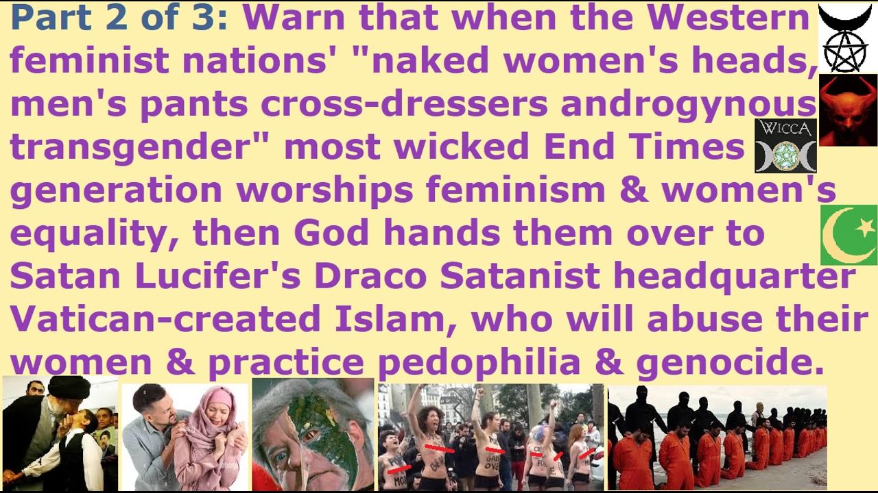 *** Intelligence news update from the Human Homo-Sapiens Race Survival Resistance (HRSR) headquarters and Republic Rebel Alliance battlefront (March 2024). When the Western feminist nations’ millions of fake Christians become “naked women’s heads, men’s pants cross-dressers androgynous transgender freaks” unidentifiable gender life forms, then God hands them over in judgment to Satan Lucifer’s Vatican Satanist headquarter underground Draco reptilian chimera fake alien base’s Islam Satanist branch and Draco avatar Satanist prophet Muhammad’s demon-possessed followers, to take over their Western feminist nations, and to slap their feminist women, and to rape their feminist women, and to torture & kill their feminist women, and to confiscate their children as pedophile child brides, and to take away women’s freedom given by Christianity. This is what Jezebel does to her own feminist human specie followers, just like their earth’s hidden matriarchal rulers reptilian hybrid pedophile cannibal Satanist witch feminists and feminist leader high priestess witch Hillary Clinton tortures & lesbian rapes (pegs) & satanically sacrifices & eats 6 million of their Western feminist nations’ girls and throws their leftover human meat & bone ashes into their supermarket groceries & church food & fast food. God’s patriarchy and his real Christian samurai men of Christ and Jesus defends the women, and loves them as their bride, and sacrifices their own lives for the genetically-unrelated total strangers 3 billion women, and treats them with honor & respect. The Western feminist nations’ millions of fanatic feminist Draco-human reptilian hybrid elite men rape the human women & little girls & little boys like a lower inferior cockroach-level specie and child sex slave industry trash, and roast & eat them in their satanic rituals, and drink their adrenochrome children’s blood. The fake Christians hide all of this, because of fear of assassinations and their families getting slaughtered and ridicule from all their church donators, and so they are accomplices in crime with them. Hypocrite feminists. They are feminists when it benefits them, but they are not feminists when they can get their intestines pulled out and skinned alive and their eyes eaten alive in the satanic rituals. The fake Christians are cowardly traitors and the scum of the world.The post-1960s generation mothers & grandmothers created this most wicked generation Western feminist nations’ harlot fake Church’s sons & grandsons who will be judged for turning God’s house into a pig sty, and who have no respect for women or love for women so that they let their women run around making mockery of God with their naked women’s heads and cross-dressing in men’s pants and looking like Western feminist nations’ “hippo” fat female church pastors, who will now be judged by sword & famine & plague & demon armies. These Western feminist nations’ feminist men treat their wives like trash and with disrespect, as if they are men and not women, and they do not treat their women like the feminine nations’ feminine real women. This is why their men are no longer marrying their Western women because they do not see them as women, so their women are hunting frantically for mates in church to breed genetic descendant idols, who will get confiscated by the reptilian elites as child sex slaves & human meat food & laboratory biochemical weapon test subjects & DNA organ harvesting products, because that is the judgment that comes upon Jezebel’s nations that forsake God’s fundamental creatures’ male & female identities.