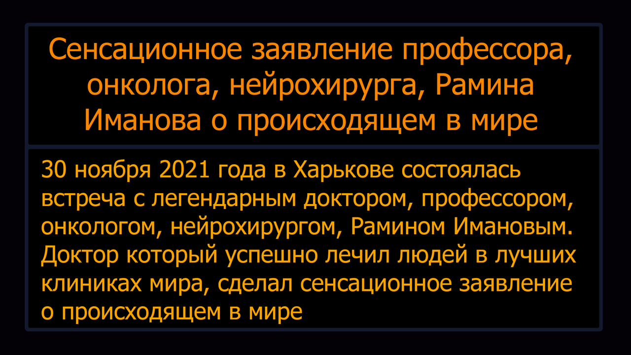 30 ноября 2021 года в Харькове состоялась встреча с легендарным доктором, профессором, онкологом, нейрохирургом, Рамином Имановым. Доктор который успешно лечил людей в лучших клиниках мира, сделал сенсационное заявление о происходящем в мире.