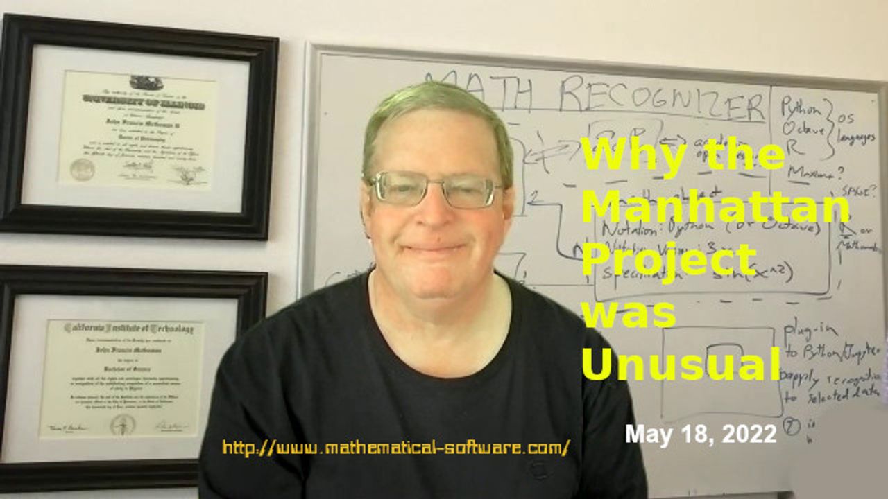 About twenty minute video on why the Manhattan Project, the World War II program that developed the first atomic bombs and reactors, is unusual among major inventions and discoveries both before and since. It was unusual in the number of major inventions and discoveries made in a few years and even more in that the first prototypes, the first full system tests (the Trinity bomb test in July 1945 and the bombings of Hiroshima and Nagasaki in August 1945) succeeded. Discusses the probable reason for this anomalous success and how it has led to inflated expectations for "New Manhattan Projects."