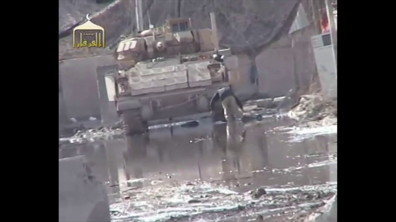 Iraqi insurgent plants bomb under US tank .
