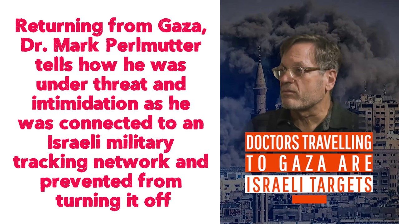 Returning from Gaza, Dr. Mark Perlmutter tells how he was under threat and intimidation as he was connected to an Israeli military tracking network and prevented from turning it off. Once he does, the Israeli military would consider the doctor an enemy combatant and target him with a missile.
