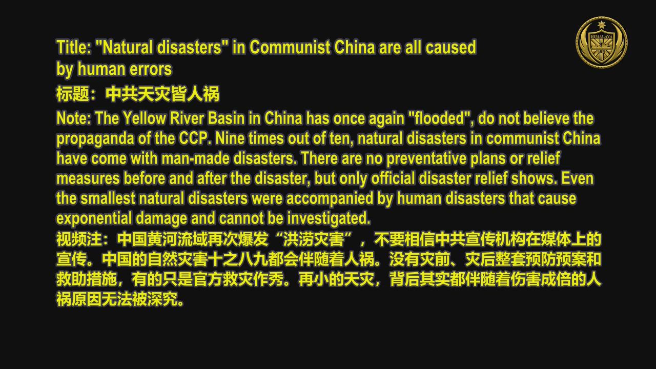 Note: The Yellow River Basin in China has once again “flooded”, do not believe the propaganda of the CCP. Nine times out of ten, natural disasters in communist China have come with man-made disasters. There are no preventative plans or relief measures before and after the disaster, but only official disaster relief shows. Even the smallest natural disasters were accompanied by human disasters that cause exponential damage and cannot be investigated.