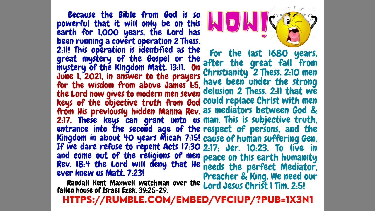 All subjective truth of men is a joke; all denominationalism, socialism, atheism, capitalism etc. It was insanity for Eve to think she knew better than God on what kind of fruit to eat, that she could take better care of herself than God had provided in the garden! God wanted men to gain knowledge of good and evil. He wanted us to try out the subjective truth of men and realize the consequences. He gave to us a strong delusion, put us in the spiritual dark ages to where we thought subjective truth was a good idea and He forced it upon humanity for 6,000 years to show that it would only bring human suffering Gen. 2:17. Subjective truth of men is like building a house upon sand. Mankind has had 6,000 years to use every kind of idea and doctrine of men to try and make life better. Now after 6,000 years of subjective truth we have a world full of the wisdom of men, the moral opinions of man and what men believe would make this earth better. We have them in Washington DC, we have them in the Vatican every town, city and nation. They have brought us ideas like; human trafficking, eating the flesh of and drinking the blood of babies. Covid 19. We have them flowing on the world wide web, on our computers, in our phones, on radio waves going through our heads, and the world is falling apart before us. Don't you wish you could turn it all off, and count it as dung? Don't you wish that you could be poor in spirit. Don't you wish that you could start preparing for the second age of the Kingdom of God where the King would build a hedge around about you, and where you would have access to all spiritual blessings that the objective truth from the KIng would give? Can't you recognize by now that God gives better gifts than men? Can you believe, by now, that the Lord God Almighty the perfect preacher has chosen you before the foundations of the world to be a Christian and in the second age of the Kingdom?