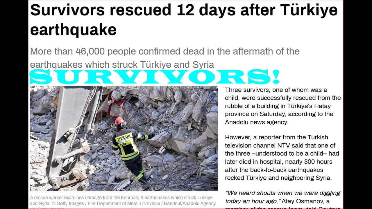 Earthquake survivors still being found as 46K sadly fall victim, pray! Pfizer due in court on March 1st, see the document!https://www.rt.com/news/571711-survivors-rescued-turkey-quake/