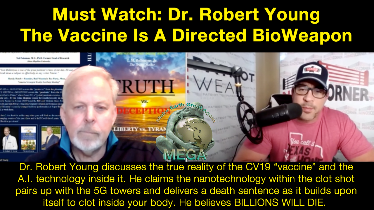 Dr. Robert Young sits down and talks with David "Nino" Rodriquez to discuss the true reality of the vaccine and the AI technology inside it. He claims the nanotechnology within the vaccine pairs up with the 5G towers and delivers a death sentence as it builds upon itself to clot inside your body. He believes BILLIONS WILL DIE. This is a must watch.