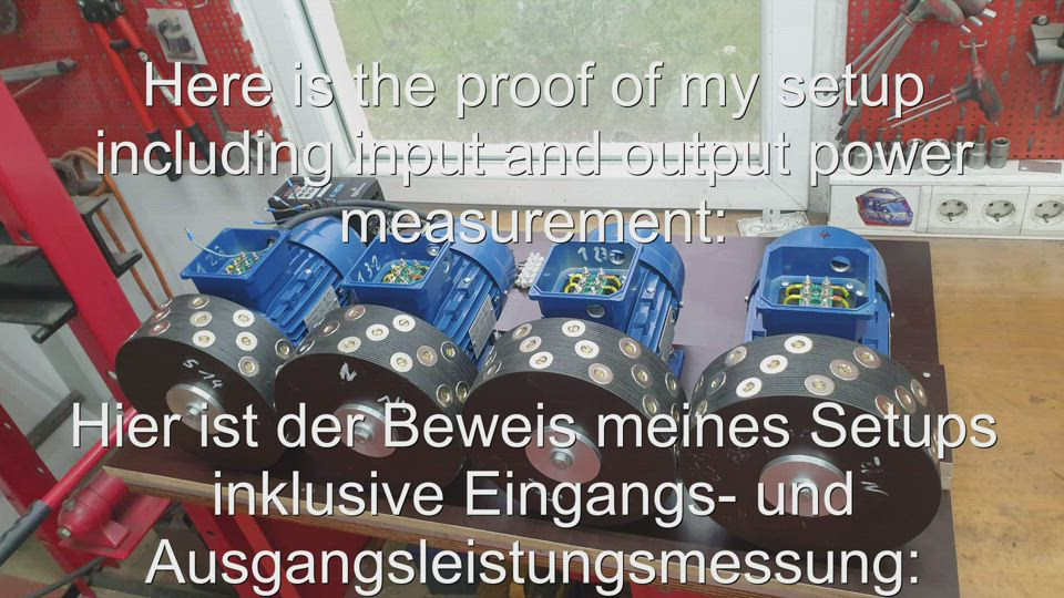 In this experiment I have rebuilt the Hatem generator by Leon Raoul Hatem. These are 4x 400 volt 0.75 KW asynchronous motors, 2 poles with a speed of 2840 RPM. 3 of these rotors were equipped with neodymium magnets to serve as a generator. Included was a frequency converter to start the unit slowly and also to allow a higher speed for measurements.