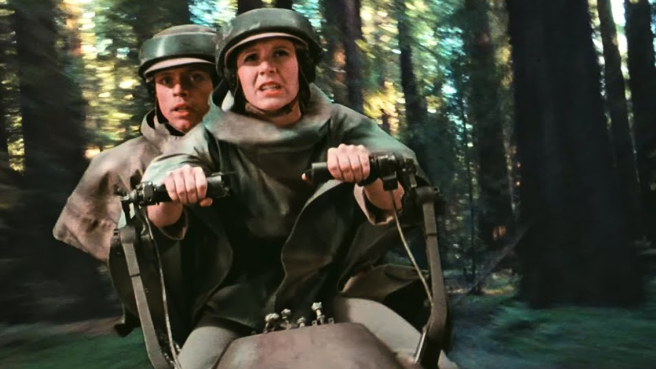 Speeder bike chase scene on Endor from Star Wars: Return Of The Jedi.