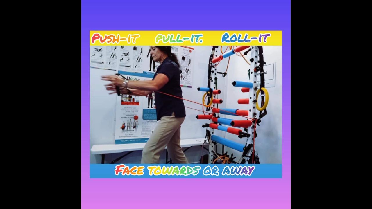 Seated resistance band fly's and overhead tri's with the Back/Rack home therapy gym.