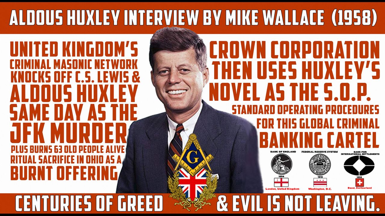 Aldous Huxley's Brave New World novel was hijacked November 22, 1963 when JFK, C.S. Lewis & Huxley was ritually sacrificed the day the United Kingdom's Masonic Mafia Train jumped the rails of sanity. That day brought Huxley's dystopian fiction novel to life by the criminal Crown Corporation which put their global Masonic traitor born-to-be degenerates into action.