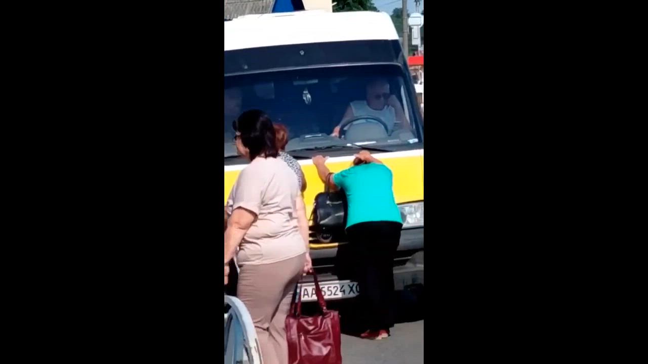 Video footage shows her attempting to block the van's path, then running after it before collapsing to the ground. Local sources report she died in the ambulance. There has been no official statement from Ukrainian authorities.