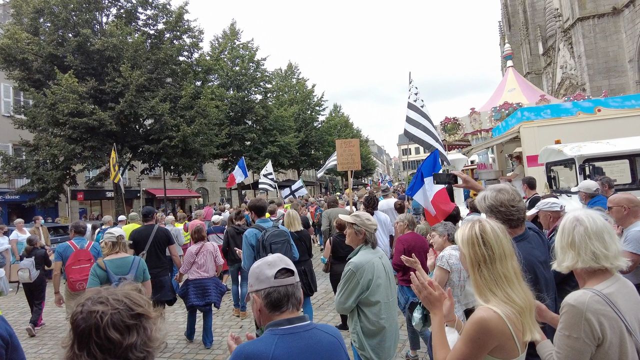 Broadcasting live from Quimper, Brittany in France for another 'manifestation' (french word for protest).. Another good turn out of people of all ages showing solidarity against the draconian government walking through the heart of the city in the middle of the day.. We are still currently subjected to the roll out of this "pass sanitaire" (vax passport, and a lot of people are not having it around the country, which is why there's been protests every saturday during the whole month of august since mid july.. On the flip, there's plenty of people who've been compliant with it all, rolled up their sleeves for the experimental jab and got their QR codes so they can continue to work in many places, go to shopping malls, and eat/drink in restaurants & bars amongst other places due to psychotic pseudo-medical science that the satanic govt uses to give reason & enforce their immoral rona rules