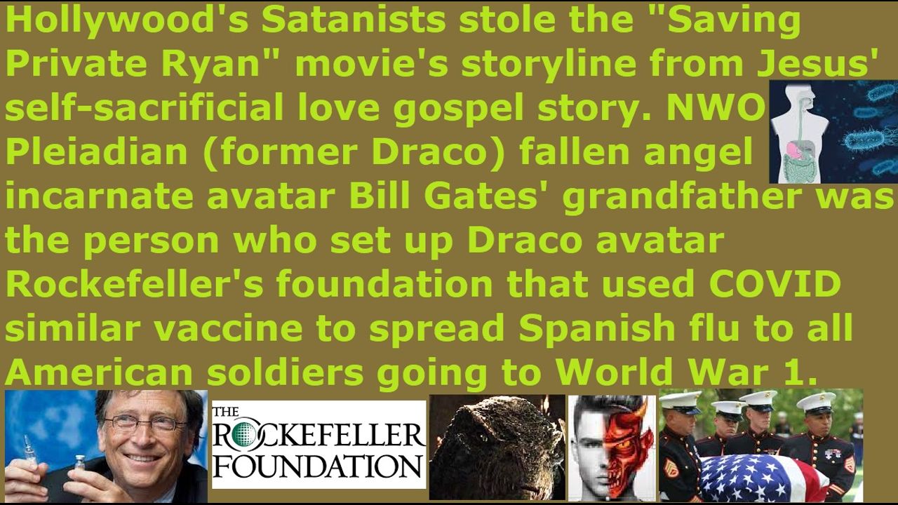 *** Intelligence news update from the Human Homo-Sapiens Race Survival Resistance (HRSR) headquarters and Republic Rebel Alliance battlefront (June 2023). Hollywood’s Satanists stole the “Saving Private Ryan” movie’s storyline from Jesus’ self-sacrificial love gospel story. NWO Pleiadian (former Draco reptilian chimera fake alien incarnate avatar) fallen angel incarnate avatar Bill Gates’ grandfather was the person who set up the Draco reptilian chimera fake alien incarnate avatar Rockefeller’s foundation that used the COVID similar vaccine to spread the Spanish flu to all the American soldiers going to World War 1, in order to depopulate as many humans made in the image of the Almighty Holy Righteous Loving Creator God YHWH Jesus. The Western feminist nations’ “women’s equality” “female church donators loving” “Jezebel spirit filled” “Satan Lucifer’s ordained & allowed & trained & non-assassination-attempts-receiving” fake unbiblical job position pastors and religious Christian hordes, who are redefining Bible verses and rebelling against women’s head coverings so that their heads are controlled by the fallen angels to stick their middle fingers up at God, and cross-dressing in “Satan Lucifer’s post-1960s cross-dress-project” men’s pants to mock God’s Word, and stealing from God and his real Christian apostles & elders 50% off the top of all their unbiblical post-1873 10% salary old laws illegal tithe income taxes for their own church staff’s and pastor’s illegal monthly salaries and for their own medical science witchcraft health insurance benefits to make God’s house into an extortionist gangster’s office, and doing hundreds of other things to remove all of God’s protection and replace Jesus with Jezebel & Sananda Jesus & Mammon & Adephagia and hundreds of other foreign fake gods, in order to bring judgment upon their Western feminist nations with sword & famine & plague & demon armies, are hiding all of this truth because of fear of assassination attempts and ridicule from church donators. Dear brethren, expose all their black nobility families and earth’s hidden matriarchal rulers elites’ names and identities and crimes and secrets and activities and plans and methods, because neither their NSA sulfuric acid & polonium radiation & mercury & flesh-eating bacteria HIV biochemical weapons, nor their FBI pinpoint heart attack EMF weapons, nor their CIA microwave oven weapons cooking alive from next door homes & rooms, nor their demon sent to attack you who rip apart their own Satanist Catholic exorcist priests in two, nor their witchcraft & psychic attacks, nor their income cut off starvation attacks, nor their CIA NSA MI6 FBI Freemason Jesuit Wicca Black Ops Satanist assassins who try to blow apart your head in your apartment lobby, nor anything else can ever harm you. Believe in God and his Word, and do not believe your pastors’ hundreds of redefined Bible verses that sow fear and unbelief and doubt and cowardice and hiding in fear and condoning evil in silence and traitor mentalities. Dear brethren, you are samurai warriors of Christ, so banzai charge the millions assassins and world rulers and their black nobility families nephilim & chimera & fallen angel incarnate avatar bosses and Draco Empire space fleets and fallen angels and Satan Lucifer and the earth’s hidden matriarchal rulers reptilian hybrid pedophile cannibal Satanist Pedogate Pizzagate “White House Pizza Night” LGBTPB (lesbian gay bisexual transvestite pedophile bestiality) orgy child sex magick ritual New Age Wicca witch feminists, who are torturing & lesbian raping (pegging) & satanic sacrificing & eating 12 million children and throwing their leftover human meat & bone ashes into the supermarket groceries & church food & fast food.