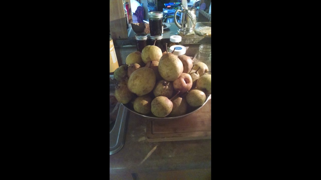 Discovered a likely seed grown pear tree in the corner of a lot. Though fruit quality is not equal to store bought pears it's still acceptably sweet and good. Very firm even ripe great for pear sauce and canned pear quarters. Also a brief showing of muscadine grapes wild foraged near to the pear tree also. Cool pink when ripe type!