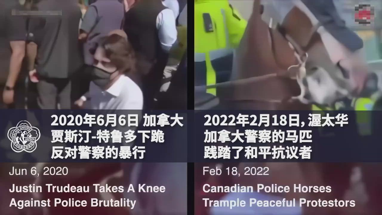 Justin Trudeau kneels against police brutality on June 6, 2020. Canadian police trample peaceful protesters on February 18, 2022